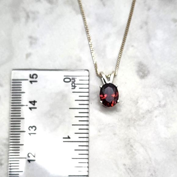 A deep raspberry red rhodolite garnet (cubic zirconia) oval pendant has been set into a sterling silver setting. The gemstone has hints of purple and has a lovely sparkle to it. Garnet is the birthstone for January.